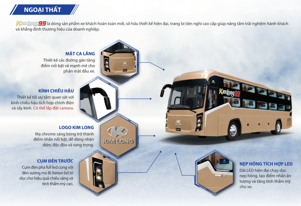 Điểm đặc biệt của Kim Long chính là thiết kế lấy cảm hứng từ hình tượng “Rồng Vàng”, cùng công nghệ lắp ráp hiện đại, động cơ tiết kiệm nhiên liệu và nhiều tiện ích vượt trội.
